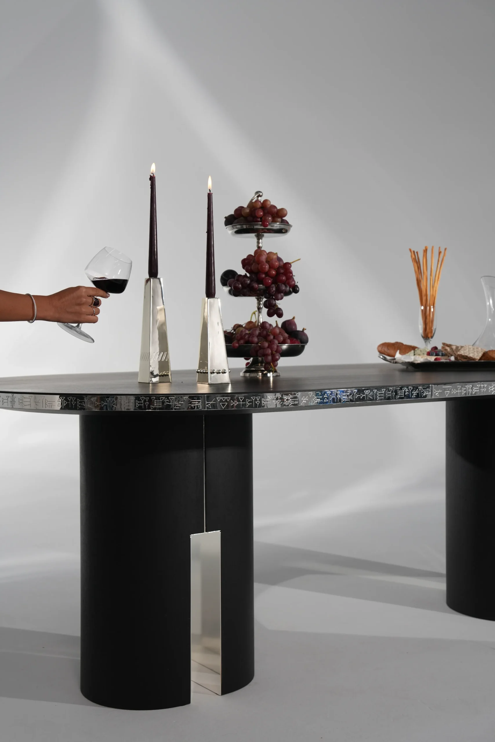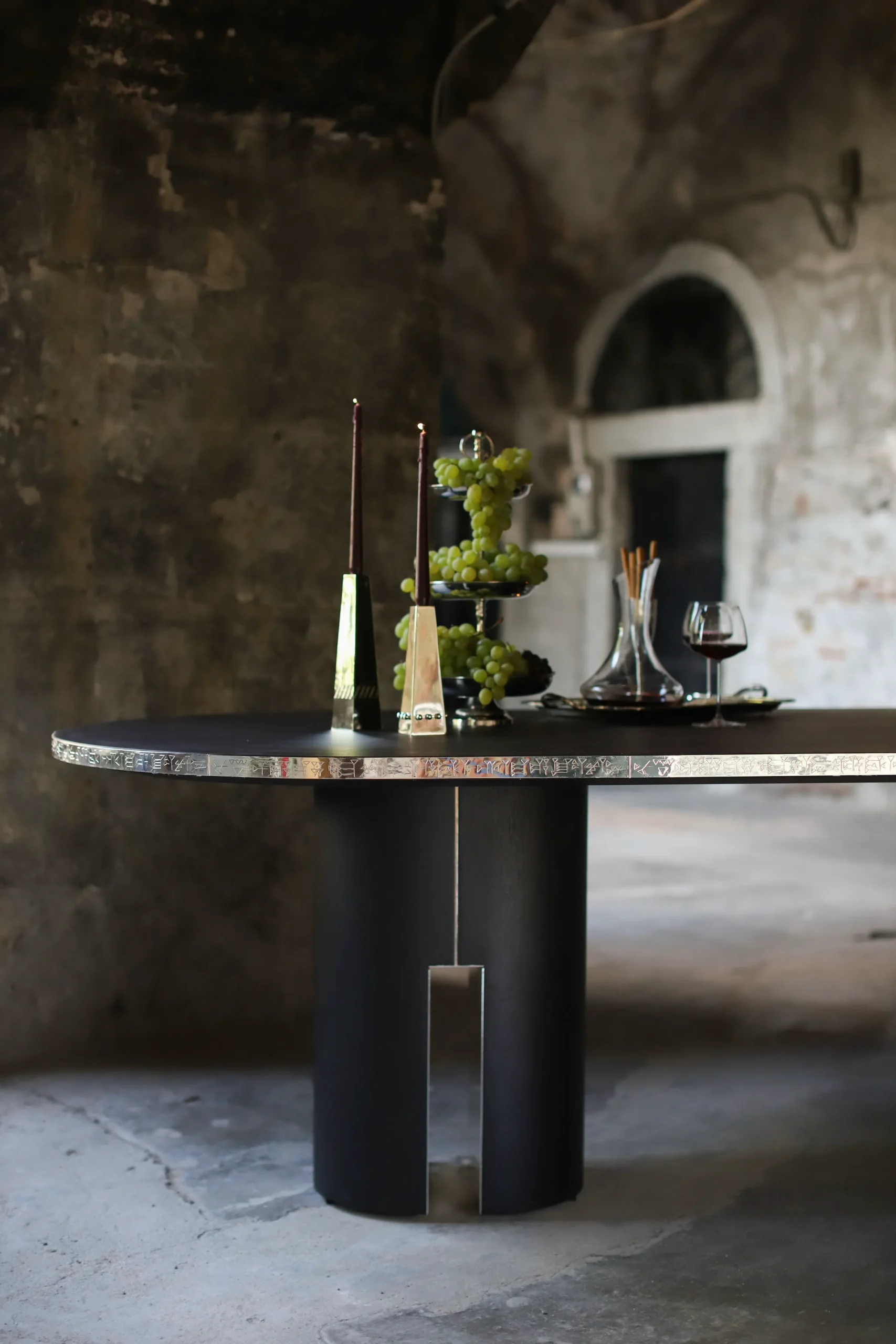 This story greatly inspired us when designing our dining table. The name “Tabarna” comes from the nick-name that the Hittite King Hattusili, who valued food and its sanctity, gave himself. On the handmade, engraved silver-plated brass detail on the front, the famous advice of King Hattusili;