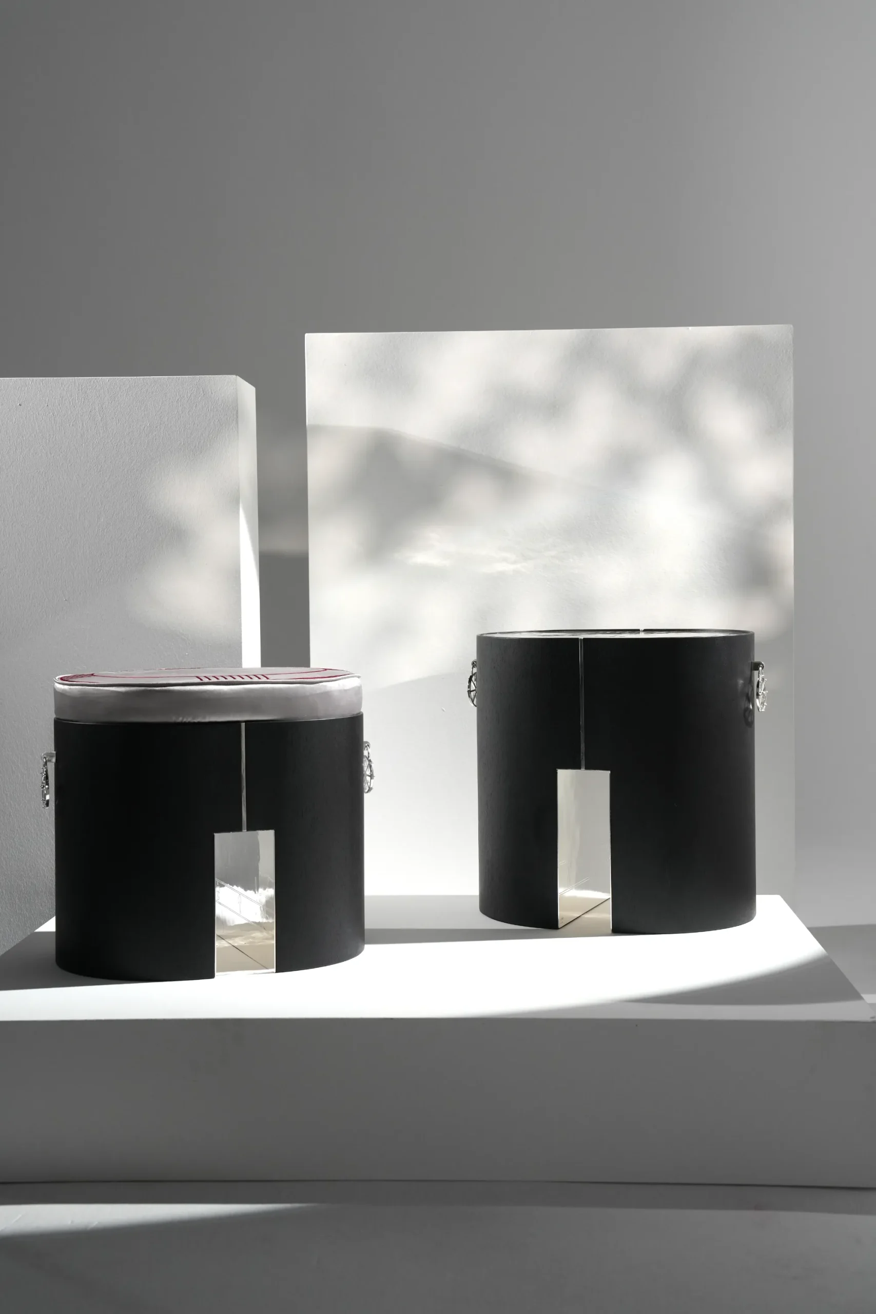 We designed the pouf and side table inspired by the hieroglyphs that fascinated us during excavations. The monumental form of both pieces is derived from the hieroglyphic symbol of Taru, the sky god responsible for the prosperity of the Hittite people.