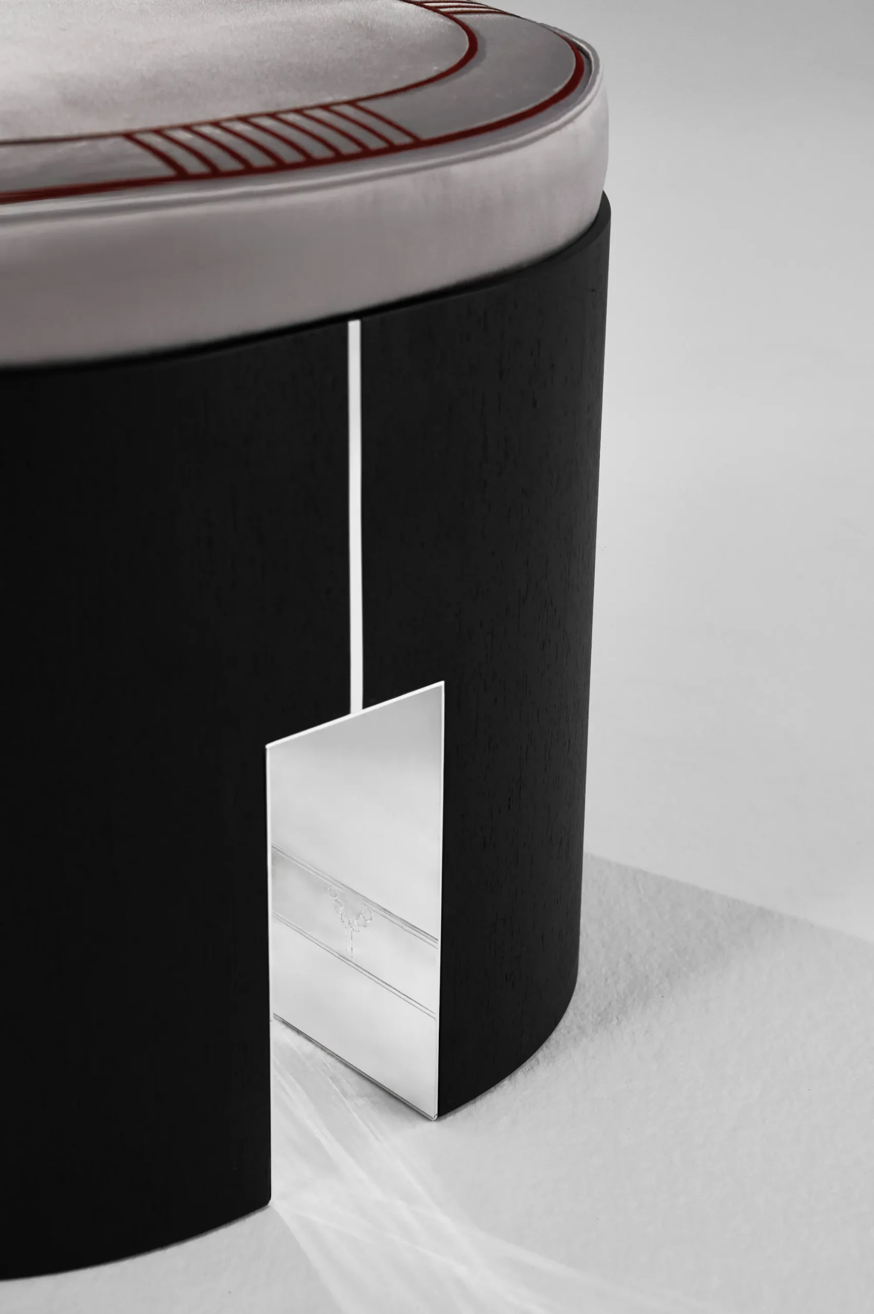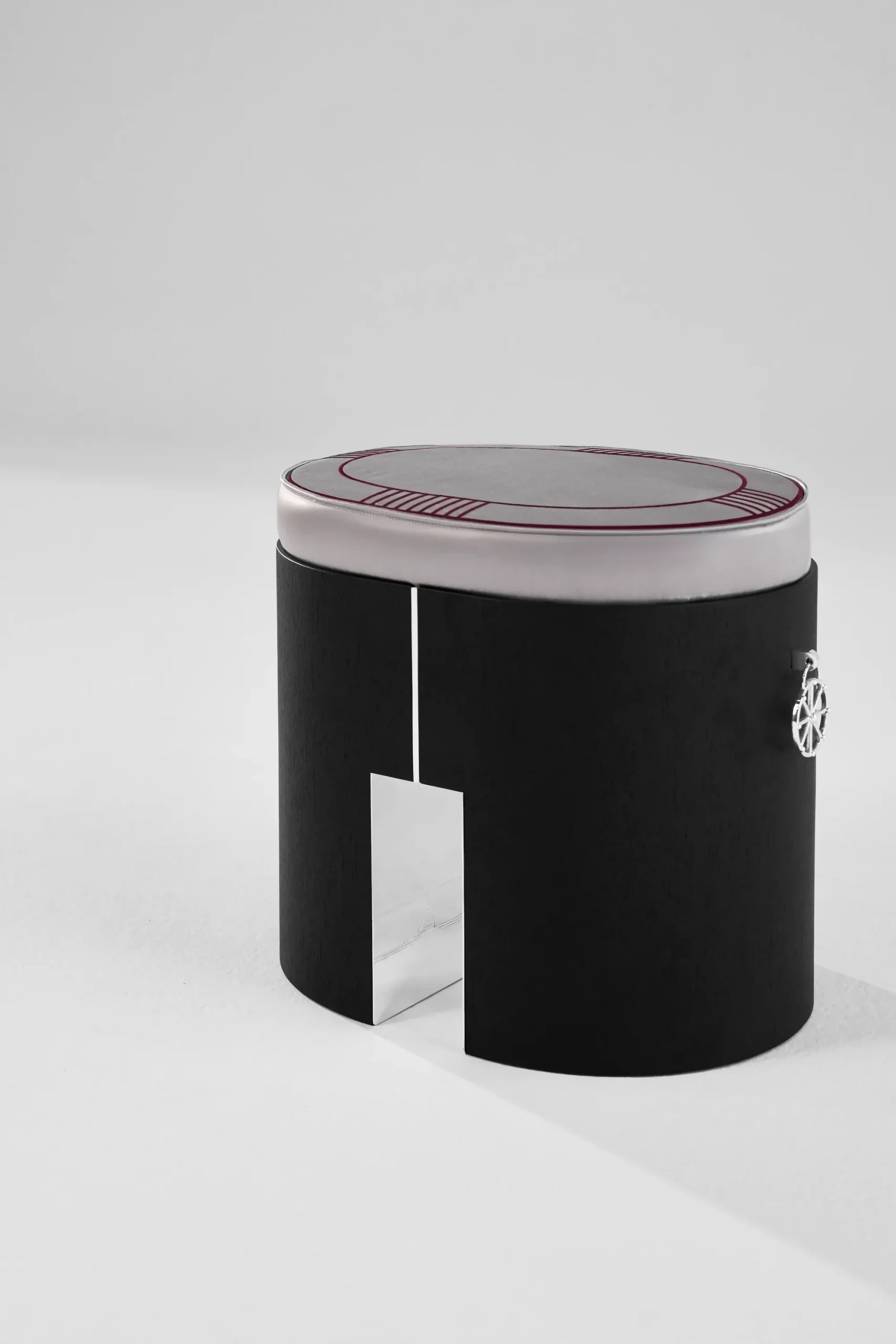 The tinned copper engravings on the inner legs feature symbols from Hittite hieroglyphs, representing our good wishes for the owner. The pouf’s cushion, made of Antakya silk weaving, and the tabletop’s silver-plated brass engravings showcase geometric patterns found on Hittite sacred vases and altars. Additionaly, we wanted to incorporate the iconic imagery of the Hittite Sun Disc, crafted by silver-plated brass details.